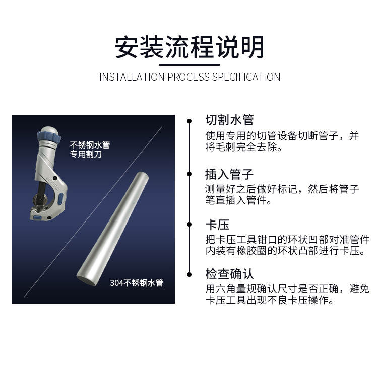 卡壓式連接~分單卡壓跟雙卡壓兩種,由德國率先垂范搭配使用的卡壓式管件,連接強度高,抗震動,滿足嵌入式安裝的要求,極大地減少了隱蔽環(huán)境中水管漏水的可能性,滿足了國家CECS153:2003標準,適合DN15-DN100口徑管道使用,避免明火焊接操作。