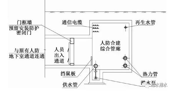 各類管線過人防合建管廊側(cè)壁處,均設(shè)計安裝防護(hù)套管。供水、再生水及熱力管道過人防通道外墻或臨空墻時,其內(nèi)側(cè)加設(shè)防爆波閥門。
